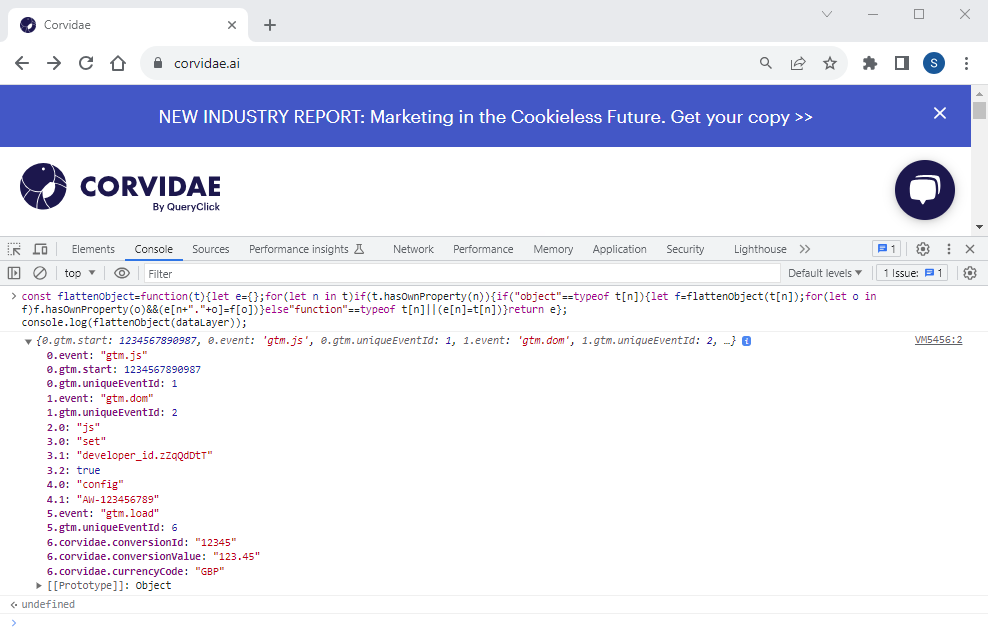 While you are setting up your Conversion Pixel it may be necessary to view your Data Layer to ensure that variables that you intend to pass to Corvidae are present and correct. To view the Google Tag Manager dataLayer in its unmodified format you can simply execute the following in the browser console: